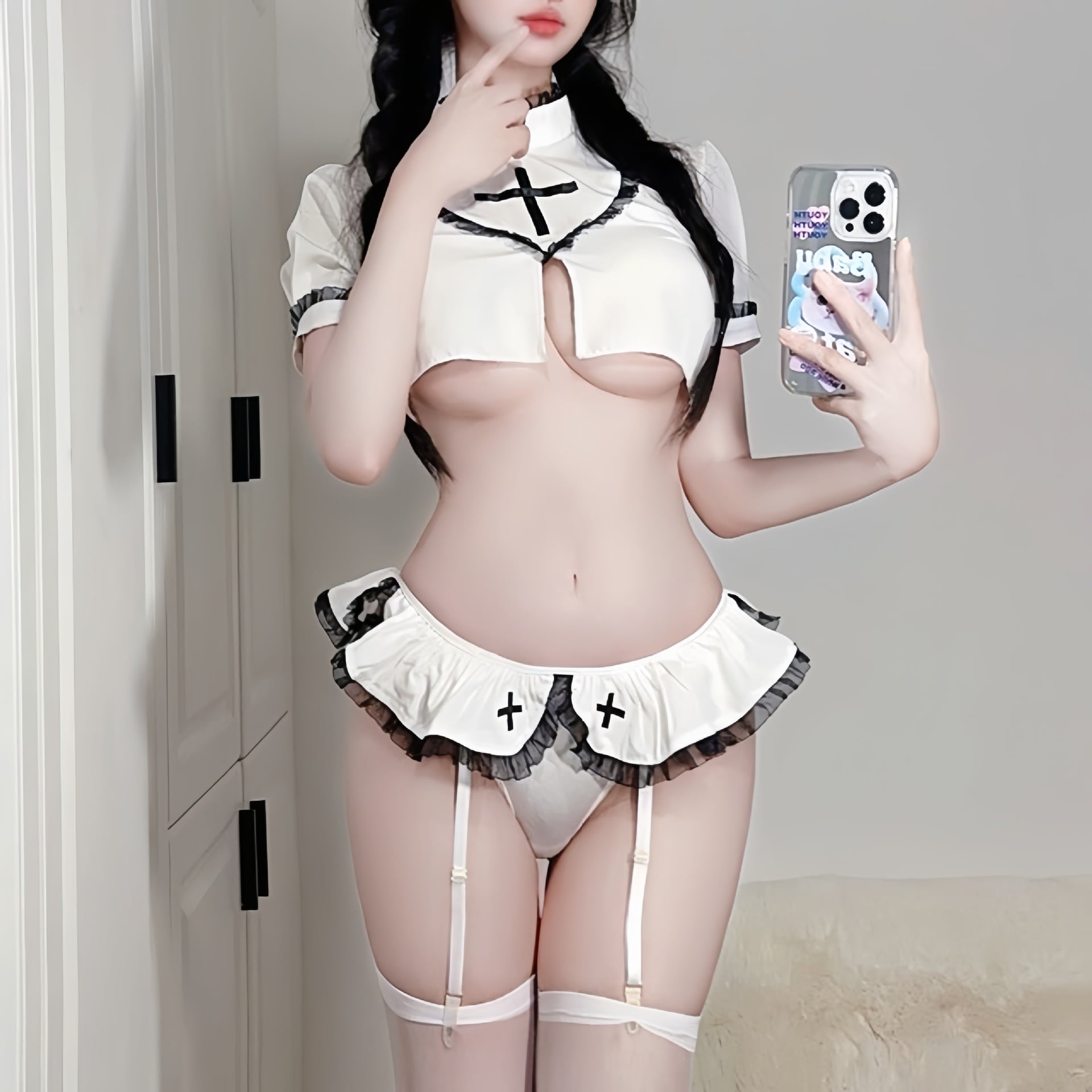 バージラインを見せる下乳超ミニ丈トップのシスターコスチュームです。