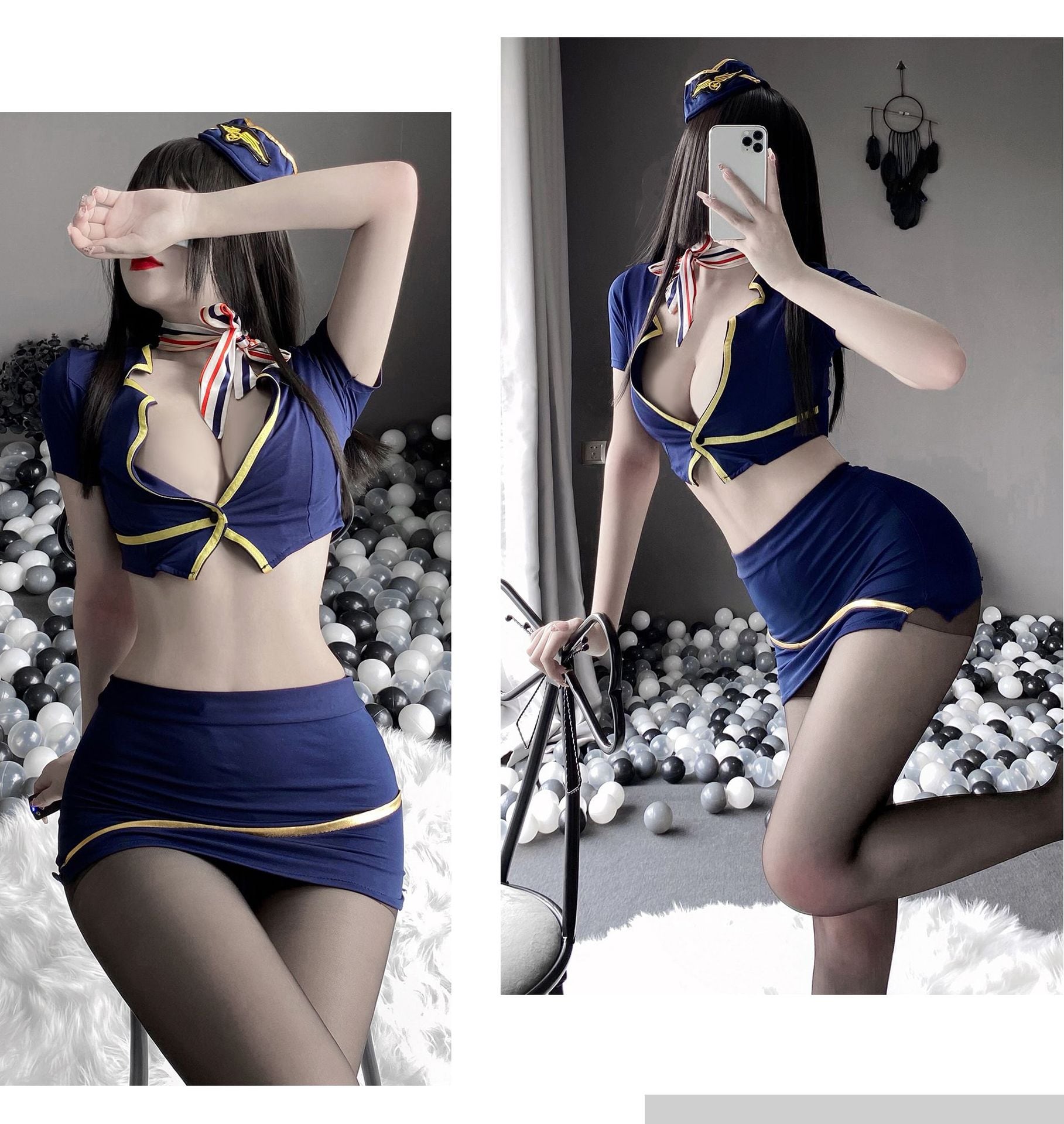 華やかで洗練された印象を与える、キャビンアテンダント風コスチューム。深みのあるネイビーブルーに、ゴールドのラインが上品さをプラス。ショート丈のトップスとミニスカートの組み合わせが、スタイルを美しく引き立てます。